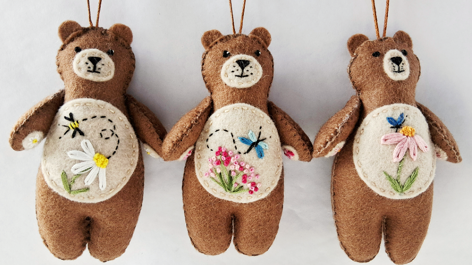 A row of brown felt bear decorations with embroidered tummies. This shows the type of decorative details you can add using just five simple embroider stitches.
